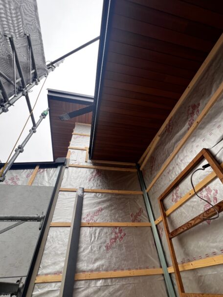 軒天の木目柄が目を引き、とても良い感じになっており、外壁が張り上がるのが楽しみです